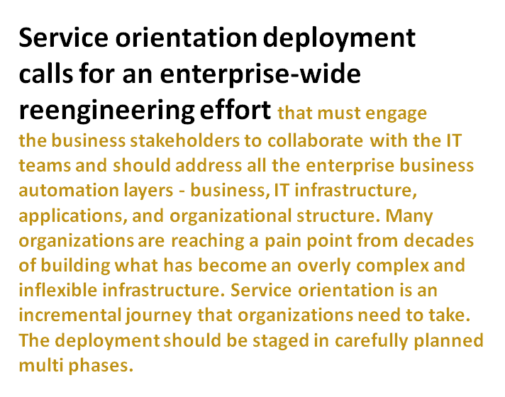 1) Leveraging Service Orientation Best Practices - enforcing principles and leveraging best practices that advance a dynamic IT integration technology and promote agile IT solutions